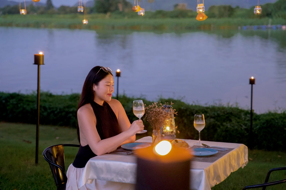 As the sun begins to set, guests are invited to enjoy sunset drinks overlooking the river, where the light shifts into warm hues of gold and amber. This peaceful moment flows naturally into a riverfront dinner, a curated meal designed to nourish the senses while the river moves quietly in the background.
