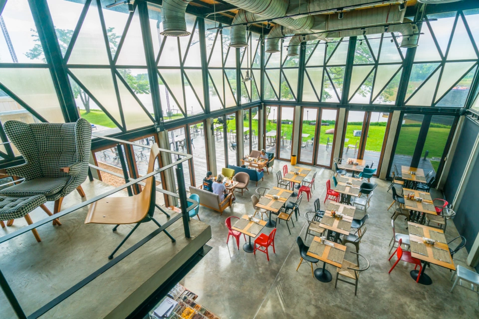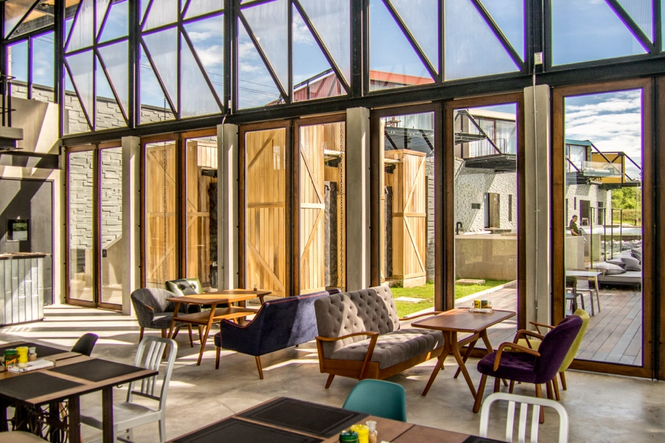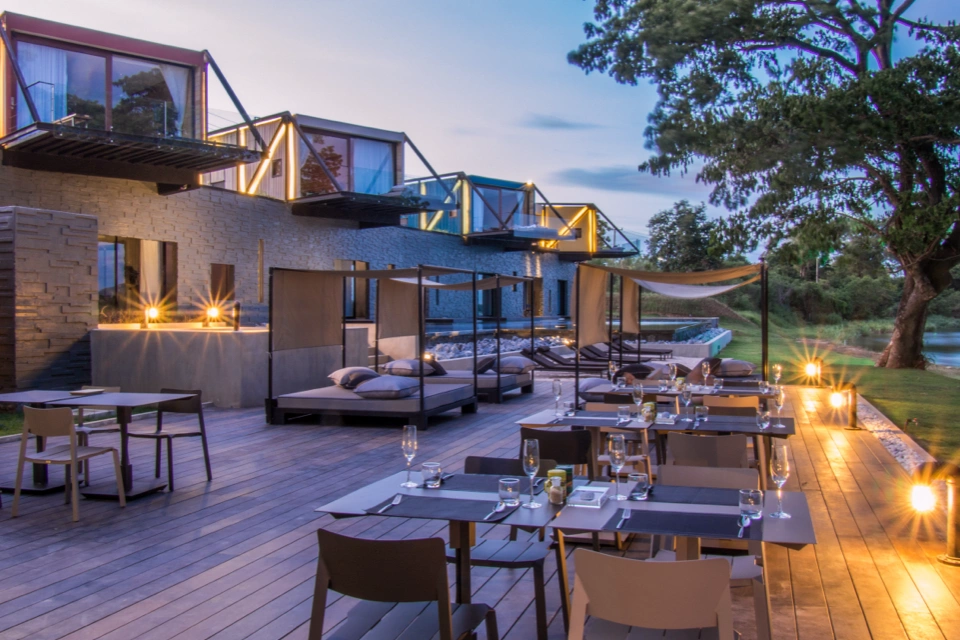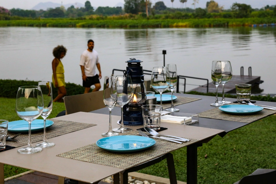 Our riverside restaurant offers a welcoming and communal atmosphere, perfect for savoring delicious meals while soaking in the beauty