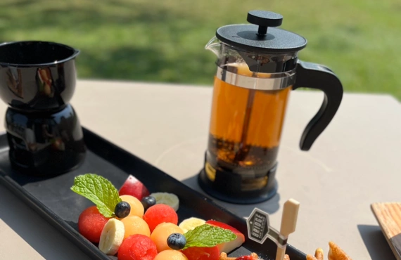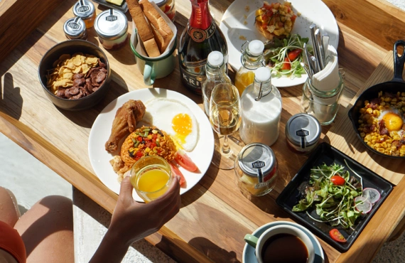 Whether you're an early riser eager to explore or prefer a leisurely brunch in your villa, our breakfast spread is available throughout the day. And to add a touch of celebration to your morning, we've included a complimentary glass of sparkling wine.