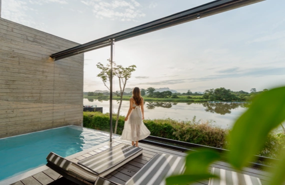 The Fallingwater Pool Villa at The Xcape River Kwai blends modern architecture with natural beauty, offering guests a private plunge pool, panoramic river views, and a peaceful atmosphere surrounded by nature.