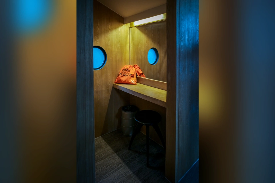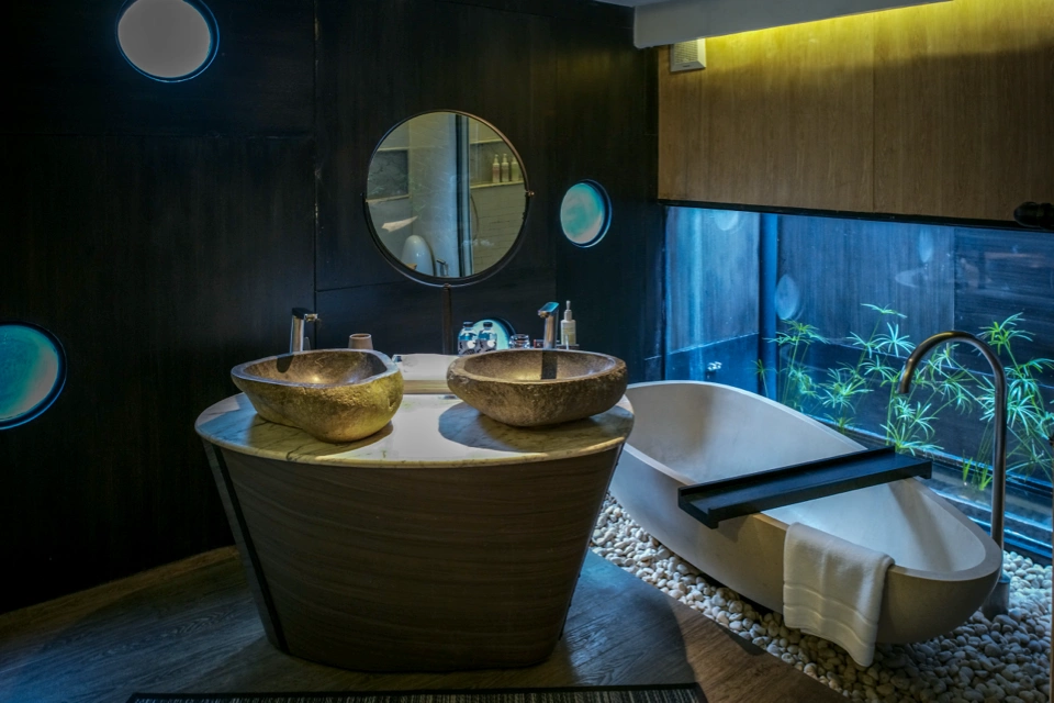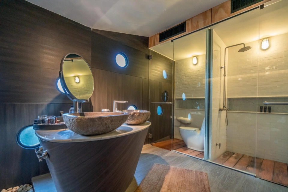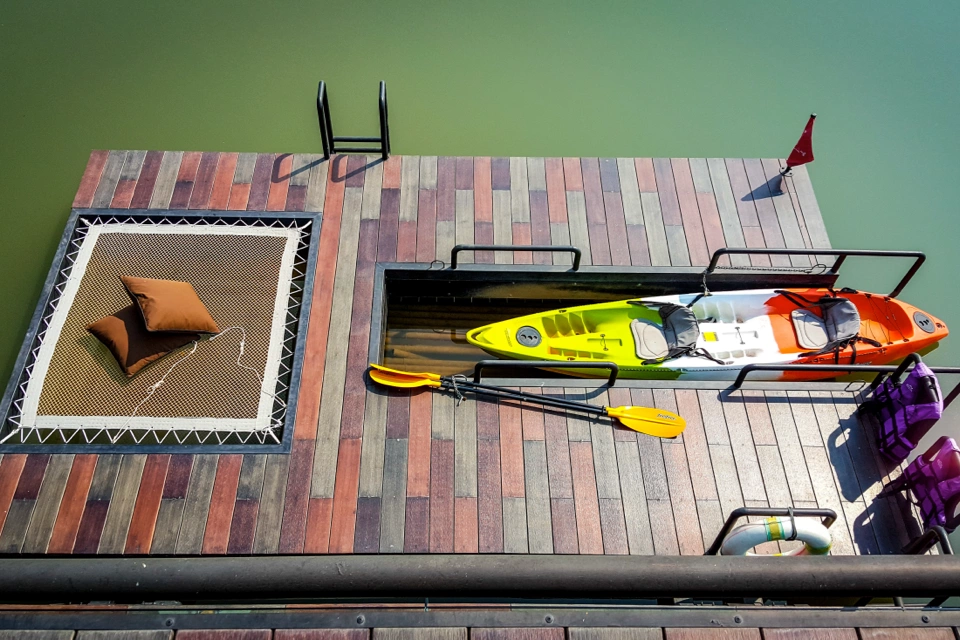 The cabin features a private rooftop deck, outdoor mesh nest bed, two-seater kayak, bathtub, and modern interiors, creating a unique floating stay experience.
