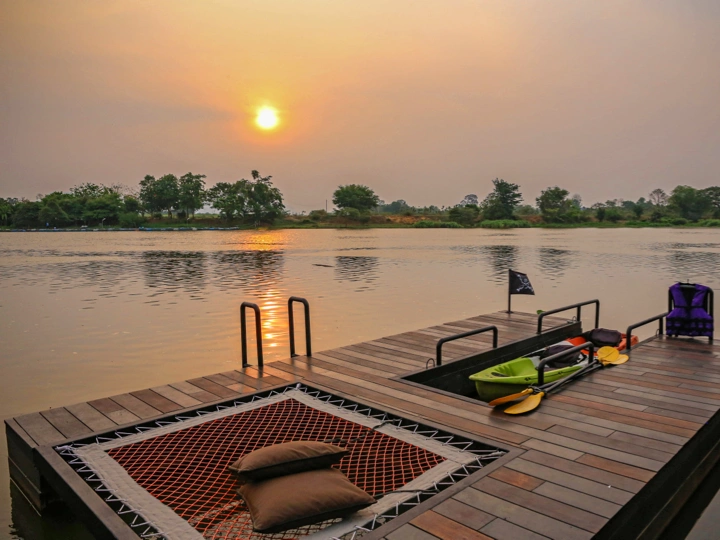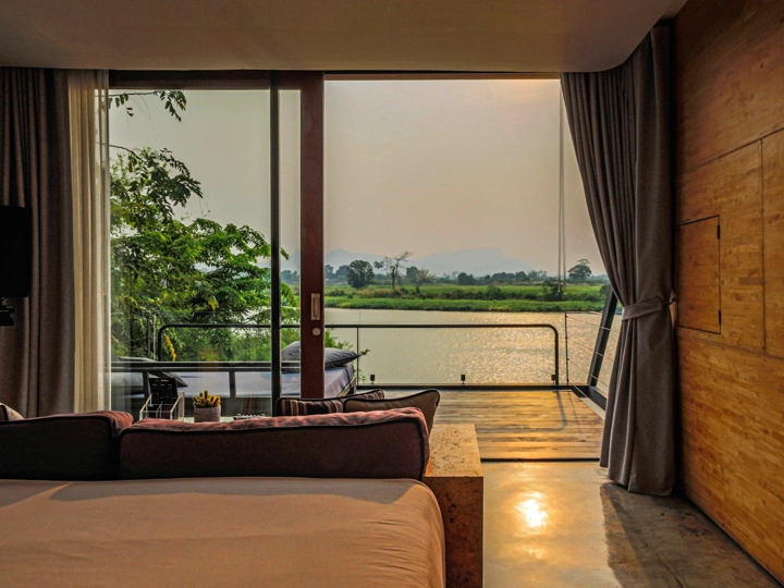 Take riverside living to the next level. This spacious room floats right on the River Kwai, offering a unique perspective and unparalleled tranquility. With a private rooftop deck, an outdoor mesh nest bed for stargazing, and your own kayak launchpad, this is where luxury meets adventure.