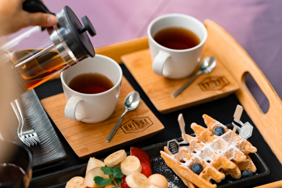 In the afternoon, guests can unwind at The Bridge Bar & Bistro with a curated tea set. This gentle pause offers time for reflection, conversation, or simply enjoying the calmness of the riverside setting.